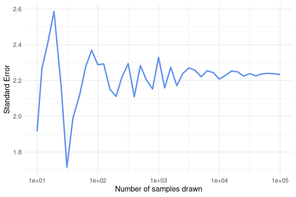 - Using similar logic as in the two previous exercises, create a simple simulation study in which you investigate the relationship between the standard error of the mean and sample size, while keeping the population mean and standard deviation constant. Vary the sample size across a reasonable range and compute the standard error for each case. Visualize your results and explain what you observe. Hint: First, create a vector of sample sizes that you want to investigate. Then, use nested