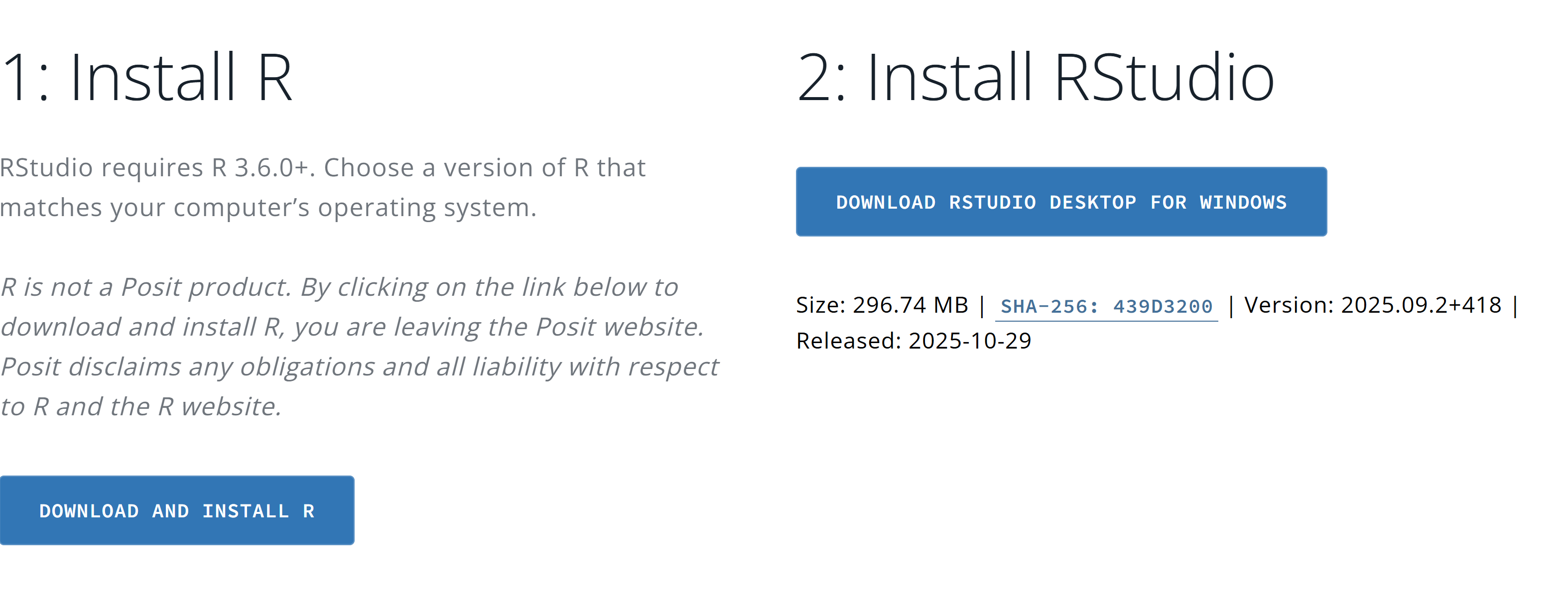 If you haven’t already, please visit Posit for instructions on downloading and installing R and RStudio. The order is important: please begin by installing R and then proceed to the RStudio installation. Ensure that you choose the correct operating system.