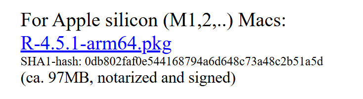 If you are using Windows, click the “Install R for Windows” option and then choose the base installation. For Mac, you will likely be using an Apple Silicon edition, in which case, please select the following: