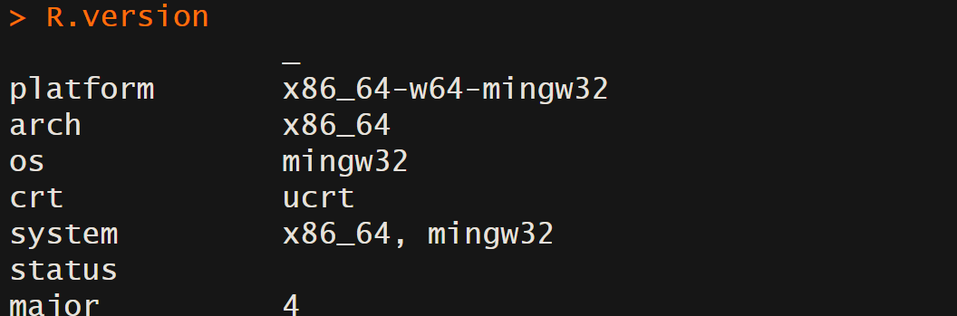 Once R and then RStudio have finished installing, execute RStudio and type R.version into the console in the lower left panel. If R has installed correctly, you should see details on your version print into the console. Mine looks like: